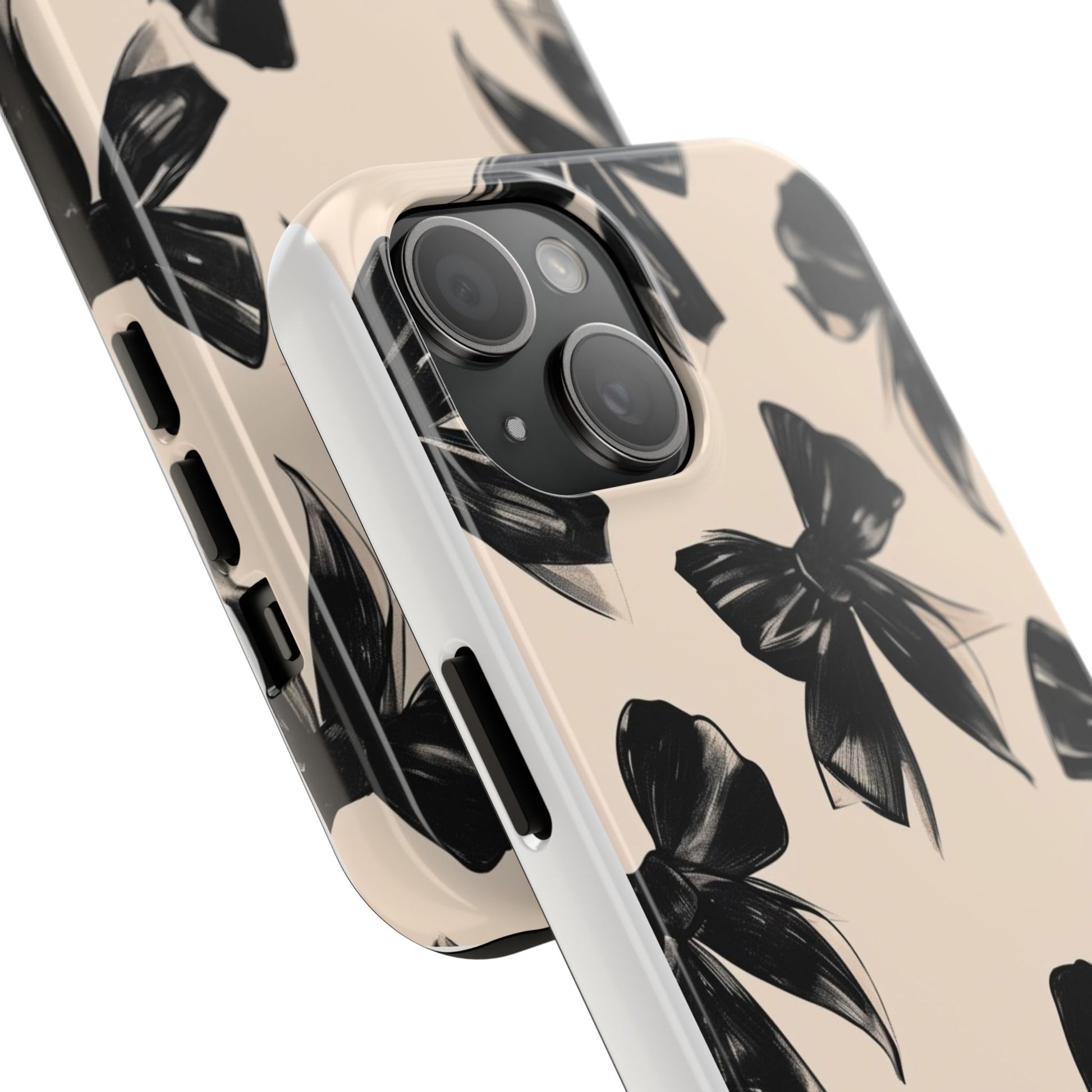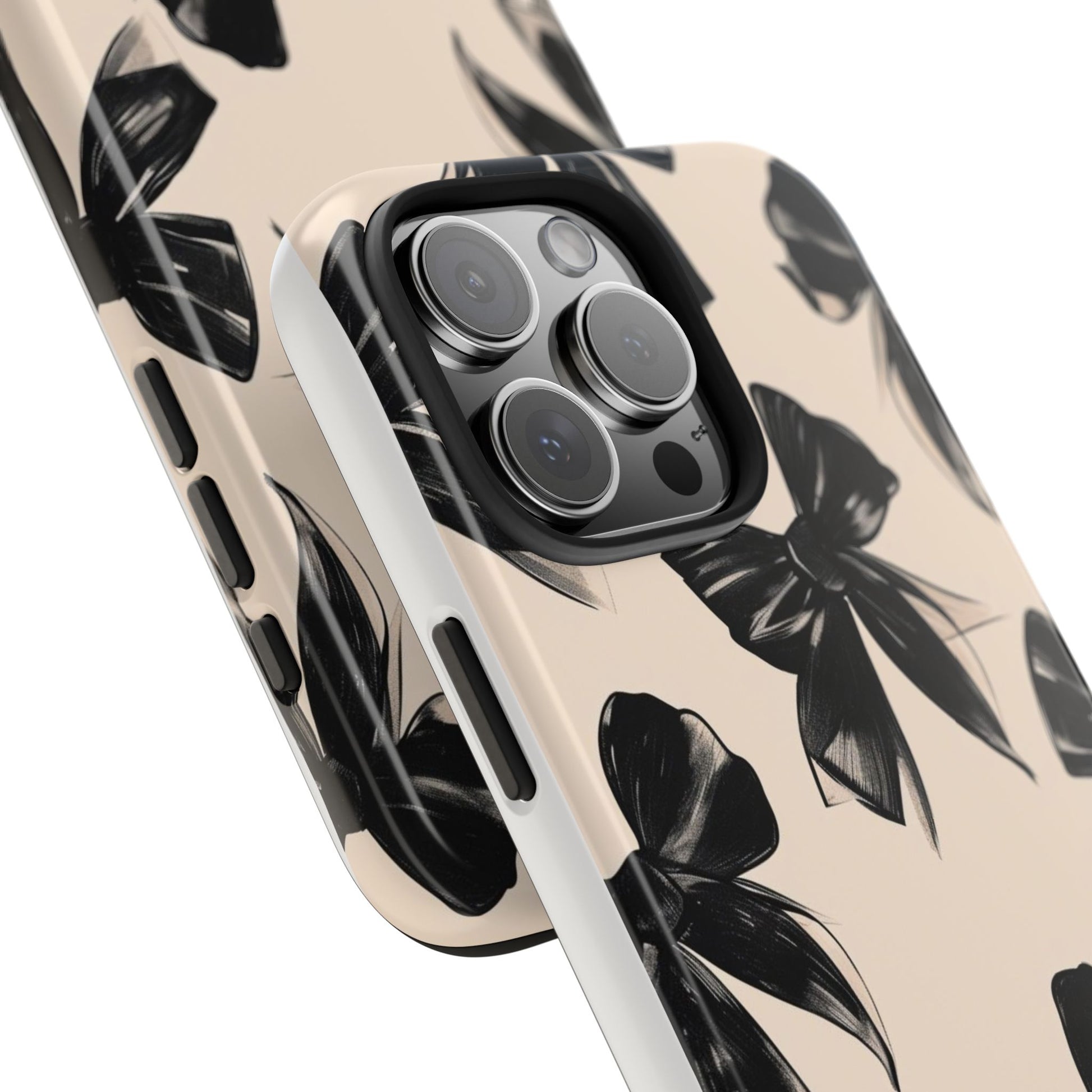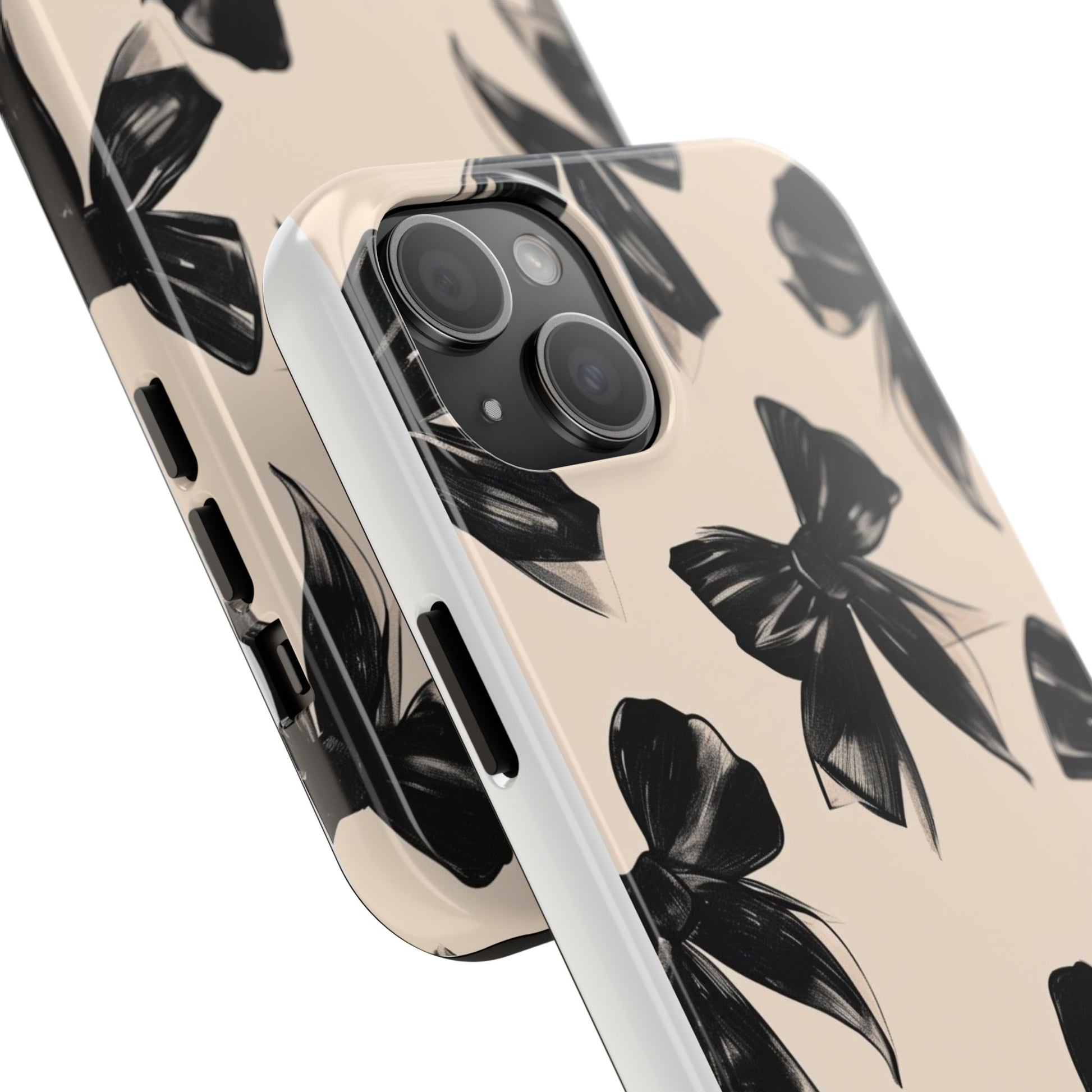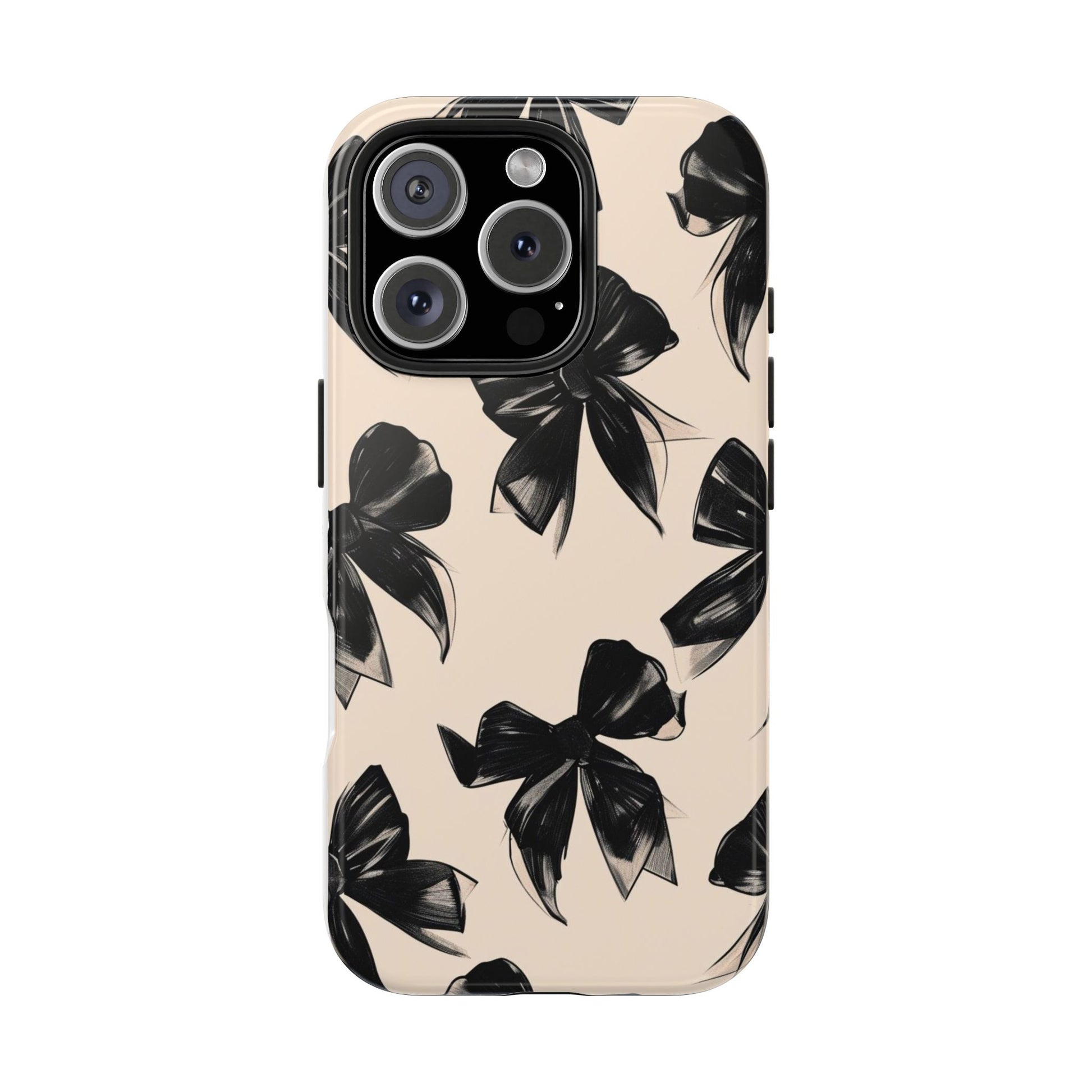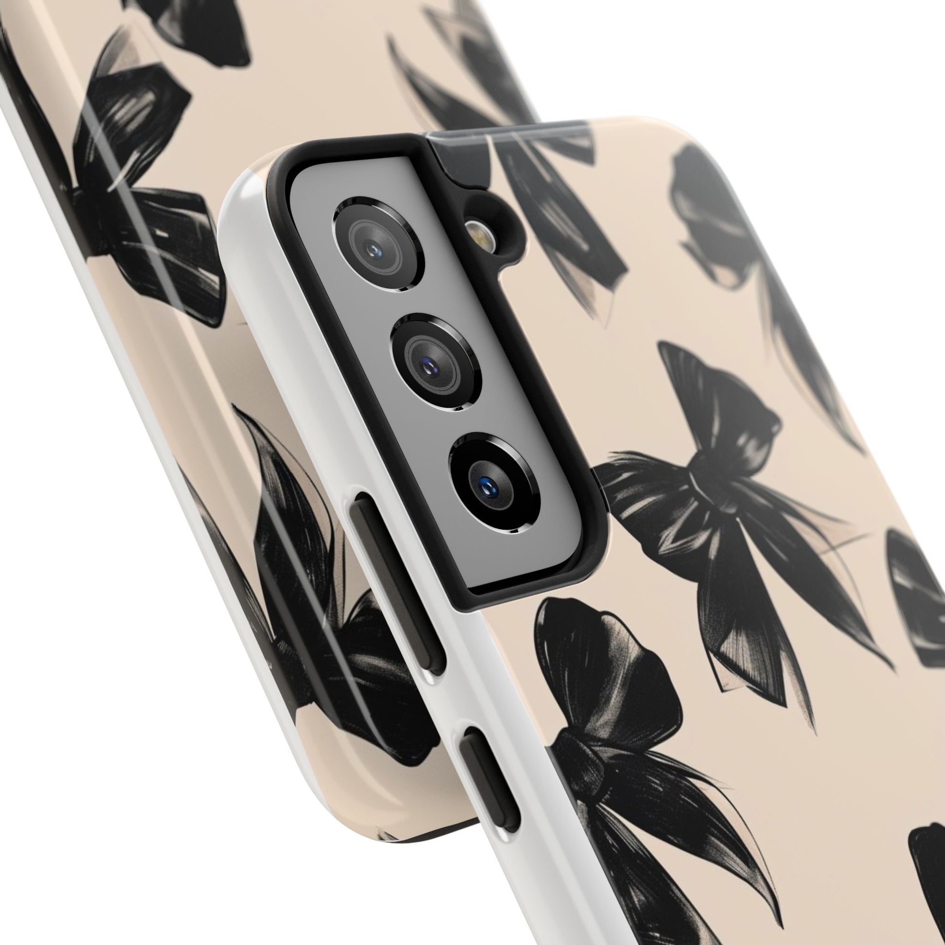Protect your phone in style with this tough phone case, designed to offer both durability and fashionable flair. The elegant black bow pattern brings a touch of sophistication to your everyday look while keeping your device safe from drops and scratches.